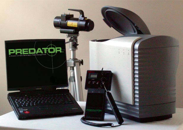 The Predator x-ray camera utilizes an x-ray source capable of penetrating a 1/2" steel pipe, and has been specially adapted for use in termite detection. Weighing only 4.5 pounds and battery-operated, the Predator camera is extremely portable and easy to use. The x-ray source is lead-shielded for safety, and uses completely re-useable film plates that erase in light after development. Exposed film plates are developed in the Predator film processing unit, which uses laser technology to create a digital picture within 3 1/2 minutes. Each digital image is stored on the Predator laptop where it can be analyzed for the presence of termites. Once termite evidence has been revealed by the Predator x-ray, the included Acoustic Emission Device (AED) is used to show whether the termites are alive or dead. The AED is a handheld probe that listens for the exact frequency of termites gnashing their teeth together. When the AED signals the existence of live termites, a termiticide can be locally applied to the location, and the termite infestation can be controlled.